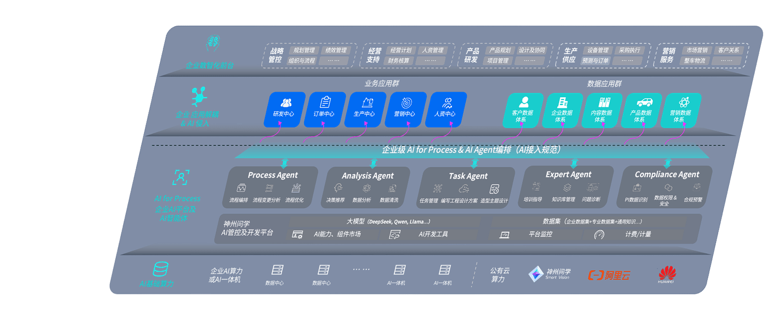 端到端的一站式AI工作空间深度融合了从企业战略规划到日常经营的全流程业务板块,,,定向解决车企内部领域多、、、部门多、、、链条长、、场景碎片化等难题,,,,支持车企快速构建以AI为核心的生产力写作体系,,,,实现任务执行与AI能力的无缝集成与交互
