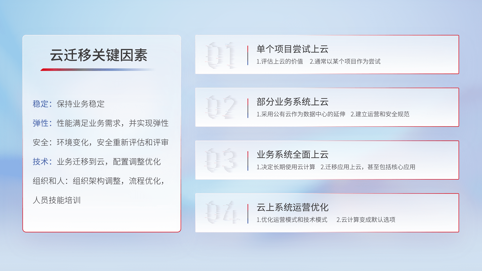 结合实际业务,,从规划设计、、云平台选型、、、、云原生改造、、数据迁移、、、集成交付,,,迁移全过程为客户识别最佳上云路径,,,做好风险识别管理,,设计网络架构、、身份权限、、、安全审计合规、、操作审计、、日志审计、、监控告警策略、、、多站点容灾设计等,,,对云上基础设施进行整体规划,,,提升IT治理水平,,,,以满足弹性、、、、高可用、、、、高性能的需求。。。。
