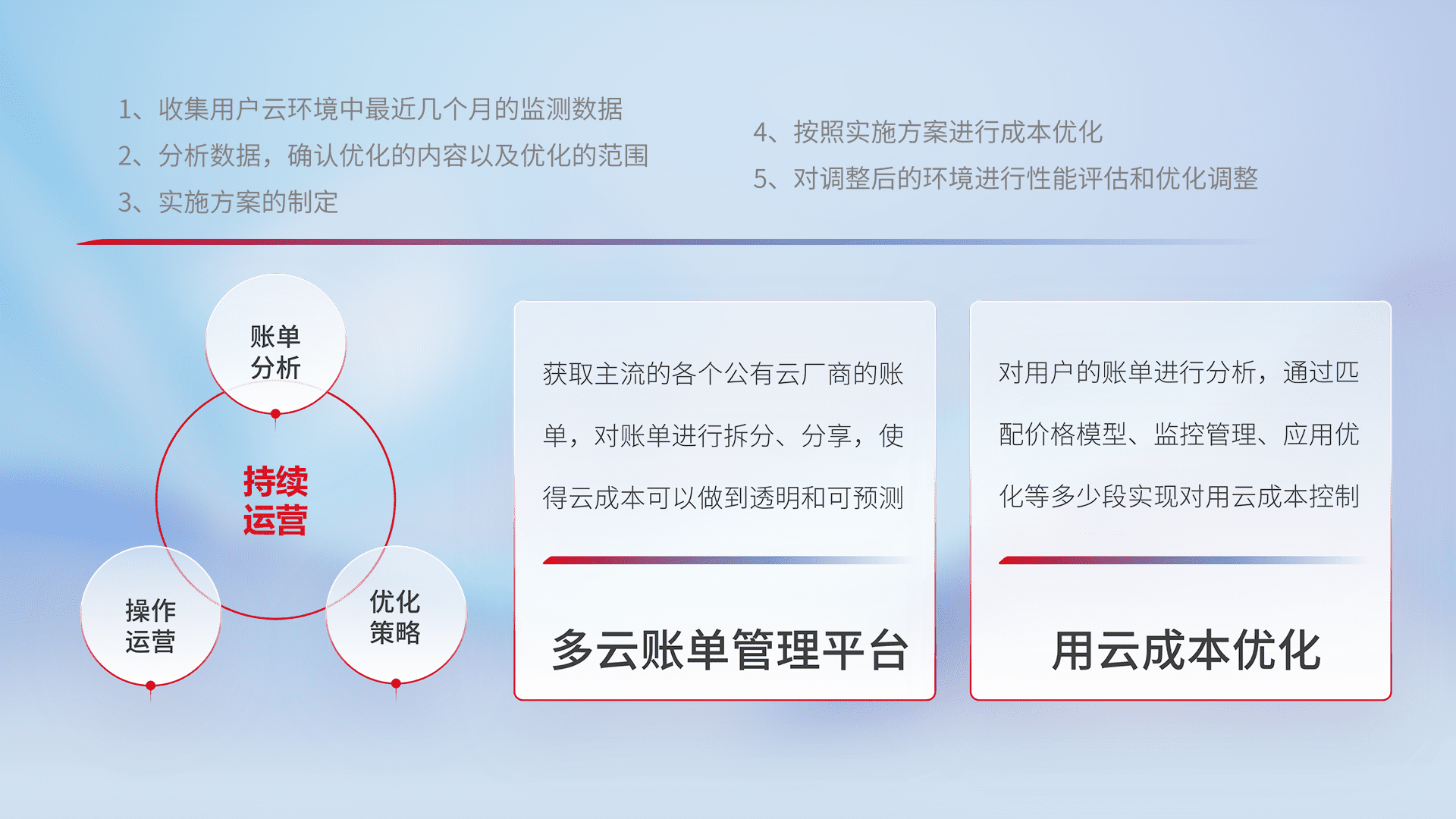 通过多云纳管,,,,以统一的资源数据模型把客户的云资源进行抽象和封装,,,,进而实现对多云资源的统一操作,,保障云资源管理的可靠性、、、稳定性与可用性。。。量身定制化运维内容,,,,配置、、、开发运维、、、、补丁管理、、、备份、、监控、、认证和访问管理、、、、审计和日常巡检等,,,,保障在用云过程中的可靠度,,,,稳定度以及高可用率。。