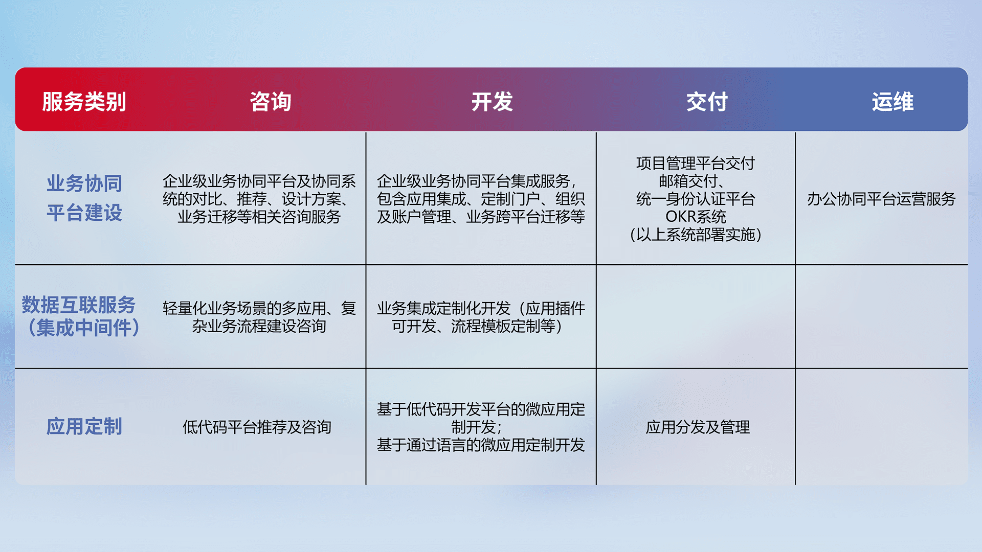 针对钉钉、、企微、、IDaas等平台级产品提供产品的规划、、、方案、、、、交付、、、、定制化开发等服务,,实现如统一协同办公、、、智能客户服务、、混合会议管理、、智能数据查询、、、等业务场景,,实现数字化转型。。。。